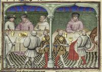 Città del Vaticano, Biblioteca Apostolica Vaticana, Pal. lat. 1989, f. 25v. Il copista del manoscritto, datato 15 giugno 1414, è Laurent de Premierfait. Il novellatore Bergamino viene ricevuto alla tavola di Cangrande della Scala; Bergamino riceve ricchi doni, tra cui una veste sontuosa ed un cavallo.