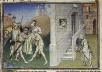 Città del Vaticano, Biblioteca Apostolica Vaticana, Pal. lat. 1989, f. 34v. Il copista del manoscritto, datato 15 giugno 1414, è Laurent de Premierfait. Martellino, fingendosi storpio, si mescola alla folla di fedeli per entrare in chiesa e vedere la salma di Sant'Arrigo; scoperto l'inganno, Martellino si trova in tribunale dinanzi al giudice.