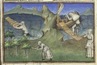 Città del Vaticano, Biblioteca Apostolica Vaticana, Pal. lat. 1989, f. 43v. Il copista del manoscritto, datato 15 giugno 1414, è Laurent de Premierfait. Landolfo Rufolo, salvatosi dal naufragio aggrappato ad una cassa, viene tirato a riva da una donna; Landolfo, recuperate le sue ricchezze, lascia la donna e salpa nuovamente verso casa.