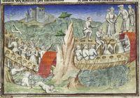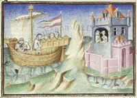 Città del Vaticano, Biblioteca Apostolica Vaticana, Pal. lat. 1989, f. 57r. Il copista del manoscritto, datato 15 giugno 1414, è Laurent de Premierfait. La nave di Alatiel fa naufragio; alla fine del viaggio Alatiel ritorna in nave dal re suo padre e dal suo promesso sposo.