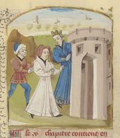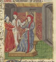 Parigi, Bibliothèque de l'Arsenal, 5192, f. 322r. Giovanni Boccaccio incontra due uomini colpiti dalla sfortuna.