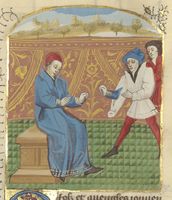 Parigi, Bibliothèque Nationale de France, Fr. 597, f. 38r. La Povertà, raffigurata come una vecchia vestita di stracci, lotta con la Fortuna, una regina in abiti eleganti; la Fortuna bifronte lega la Sfortuna, raffigurata come un uomo nudo coperto di piaghe, ad un palo.