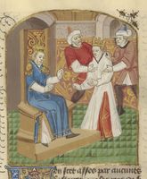 Parigi, Bibliothèque de l'Arsenal, 5192, f. 323r. L'imperatore Isacco Angelo viene accecato per mezzo di uno specchio.