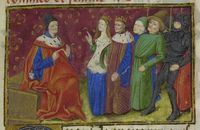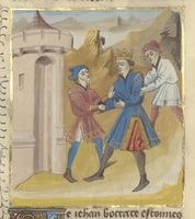 Parigi, Bibliothèque de l'Arsenal, 5192, f. 336v. Gli abitanti di Firenze invitano Gualtieri di Brienne, duca d'Atene, ad assumere il governo della città (?).