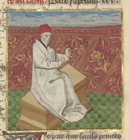 Parigi, Bibliothèque de l'Arsenal, 5192, f. 319r. Belzet siede sul trono utilizzando Diogene come poggiapiedi.