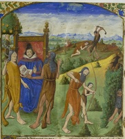 Parigi, Bibliothèque Nationale de France, Fr. 597, f. 2r. Adamo ed Eva, vestiti di pelli d'animale, appaiono a Giovanni Boccaccio; sullo sfondo, Caino uccide Abele; Lamech, armato di arco e frecce, uccide il suo antenato Caino nascosto in un cespuglio.