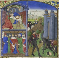 Parigi, Bibliothèque de l'Arsenal, 5192, f. 327r. Un sovrano viene decapitato da due uomini.