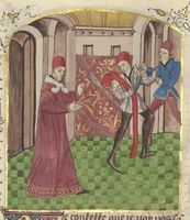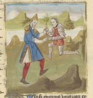 Parigi, Bibliothèque de l'Arsenal, 5192, f. 283r. Giovanni Boccaccio incontra due uomini colpiti dalla sfortuna.