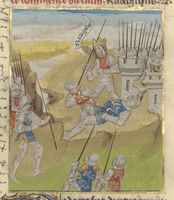 Parigi, Bibliothèque de l'Arsenal, 5192, f. 287r. Gli eserciti di Radagaiso e Stilicone si scontrano.