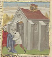 Parigi, Bibliothèque de l'Arsenal, 5192, f. 276v. I soldati di Galerio perseguitano i Cristiani; Galerio è inginocchiato in penitenza all'interno di una abitazione.