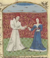 Parigi, Bibliothèque de l'Arsenal, 5192, f. 301v. Giovanni Boccaccio incontra una donna.