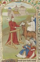Parigi, Bibliothèque de l'Arsenal, 5192, f. 297v. Giovanni Boccaccio incontra due uomini colpiti dalla sfortuna.