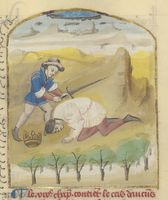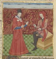 Parigi, Bibliothèque de l'Arsenal, 5192, f. 150r. Giovanni Boccaccio conversa con un uomo colpito dalla sfortuna.