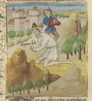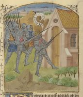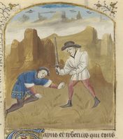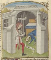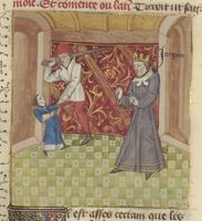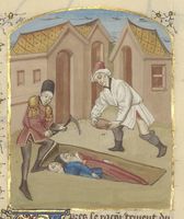 Parigi, Bibliothèque de l'Arsenal, 5192, f. 168v. Geronimo, tiranno di Siracusa, viene assassinato da due sudditi.