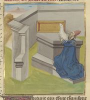 Parigi, Bibliothèque de l'Arsenal, 5192, f. 198r. Cleopatra IV cerca rifugio dai sicari mandati ad assassinarla nascondendosi dietro una statua di Apollo.