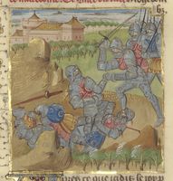 Parigi, Bibliothèque de l'Arsenal, 5192, f. 194r. Le mogli dei Cimbri in armatura affrontano l'esercito romano.