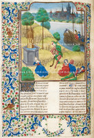 Parigi, Bibliothèque Nationale de France, Fr. 2203, f. 1r. Il manoscritto è datato 1395. Gualtieri di Saluzzo esce dal palazzo per andare a caccia col falcone, osservato da un uomo seduto sotto un albero (Giovanni Boccaccio?) che scrive su un rotolo di pergamena.