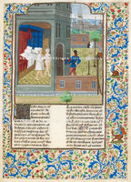 Bruxelles, Koninklijke Bibliotheek van België, 9232, f. 444v. La miniatura riassume diverse scene della novella di Griselda: in alto a sinistra, Gualtieri di Saluzzo sposa Griselda; in alto a destra, Gualtieri si reca presso la casa di Giannucole per chiederne la figlia in sposa; in basso a sinistra, Gualtieri ripudia Griselda, la quale lascia la casa con indosso solo un camicia; in basso a destra, all'interno del castello del marchese, Gulatieri conversa con un personaggio, quindi si svolge il banchetto finale durante il quale Griselda si ricongiunge con i suoi figli.