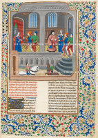 Londra, British Library, Add. 35322, f. 178r. Tancredi ordina l'esecuzione di Guiscardo ed assiste alla sua decapitazione; Ghismonda riceve da un servo una coppa con il cuore dell'amato.
