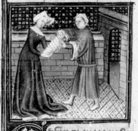 Parigi, Bibliothèque Nationale de France, Fr. 12459, f. 139r. Il copista del manoscritto, datato 21 aprile 1414, è Jehan de Lengres. Griselda si separa dal figlio, consegnandolo al messo mandato da Gualtieri.