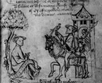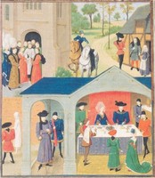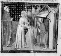 Parigi, Bibliothèque Nationale de France, Fr. 12459, f. 136r. Il copista del manoscritto, datato 21 aprile 1414, è Jehan de Lengres. Gualtieri, avendo scelto Griselda come sua sposa, si reca con il suo seguito presso la casa di Giannucole per incontrare la fanciulla.