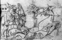Parigi, Bibliothèque Nationale de France, Fr. 2203, f. 14r. Il manoscritto è datato 1395. Gualtieri e il suo seguito si recano a caccia di un cervo.