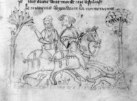 Parigi, Bibliothèque Nationale de France, Fr. 12459, f. 135r. Il copista del manoscritto, datato 21 aprile 1414, è Jehan de Lengres. Gualtieri di Saluzzo va a caccia di un cervo con i suoi cortigiani; una delegazione di sudditi esorta il marchese a prender moglie.