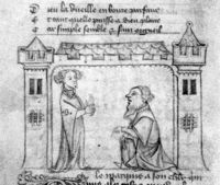 Parigi, Bibliothèque Nationale de France, Fr. 2203, f. 17v. Il manoscritto è datato 1395. Gualtieri convoca Giannucole al castello per comunicargli la sua intenzione di sposare Griselda.