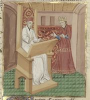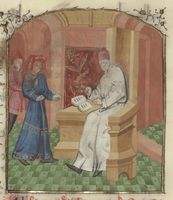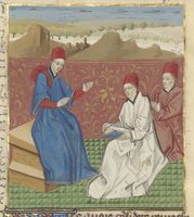 Parigi, Bibliothèque de l'Arsenal, 5192, f. 97r. Giovanni Boccaccio, seduto in cattedra, discute con due legisti.