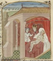 Parigi, Bibliothèque de l'Arsenal, 5192, f. 59v. In seguito ad un sogno premonitore, Astiage consegna il nipote Ciro ad un servitore perché lo uccida.
