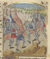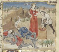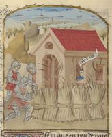 Parigi, Bibliothèque de l'Arsenal, 5192, f. 65v. Adrasto uccide per errore Atis, figlio di Creso, durante una battuta di caccia al cinghiale; il figlio di Creso interviene per salvare la vita del padre, che sta per essere ucciso da un soldato persiano.