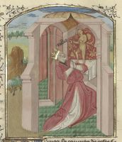 Parigi, Bibliothèque de l'Arsenal, 5192, f. 75r. Tullo Ostilio prega inginocchiato dinanzi alla statua di un dio.