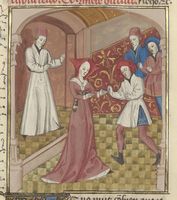 Parigi, Bibliothèque de l'Arsenal, 5192, f. 80r. Giovanni Boccaccio e Lucrezia incontrano tre uomini.