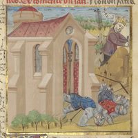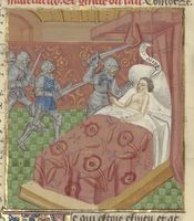 Parigi, Bibliothèque de l'Arsenal, 5192, f. 55v. Amasia viene assassinato da due uomini.