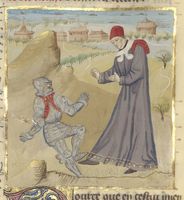 Parigi, Bibliothèque de l'Arsenal, 5192, f. 102r. Giovanni Boccaccio incontra un soldato.