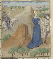 Parigi, Bibliothèque de l'Arsenal, 5192, f. 20v. Meleagro offre ad Atalanta la testa del cinghiale calidonio; sullo sfondo giacciono i corpi degli zii di Meleagro.