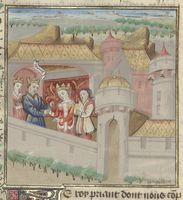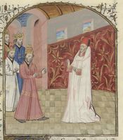 Parigi, Bibliothèque de l'Arsenal, 5192, f. 25v. Priamo ed Ecuba accolgono Paride ed Elena al loro arrivo a Troia.