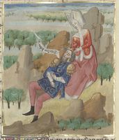 Parigi, Bibliothèque de l'Arsenal, 5192, f. 13v. Laio interroga Apollo; il pastore Forbante slega il piccolo Edipo, appeso ad un albero per i piedi, per portarlo con sé.
