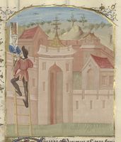 Parigi, Bibliothèque de l'Arsenal, 5192, f. 34r. Un uomo scala le mura di una città per raggiungere la sua amata.