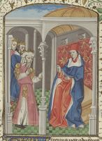 Parigi, Bibliothèque de l'Arsenal, 5192, f. 41v. Roboamo, seduto sul trono, ascolta le suppliche dei suoi sudditi.