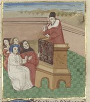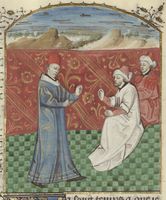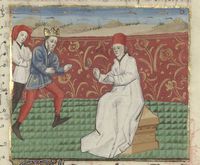 Parigi, Bibliothèque de l'Arsenal, 5192, f. 31r. Giovanni Boccaccio mostra ad un sovrano le virtù della Povertà.
