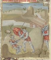 Parigi, Bibliothèque de l'Arsenal, 5192, f. 12r. Durante la fuga insieme a Giasone, Medea uccide suo fratello Apsirto (Egialeo); re Eete insegue Medea e Giasone con un manipolo di soldati.