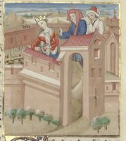 Parigi, Bibliothèque de l'Arsenal, 5192, f. 45v. La regina Gezabele viene gettata da una torre; la regina Atalia viene decapitata.