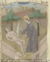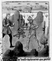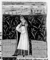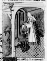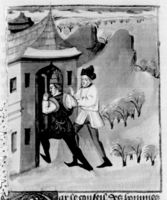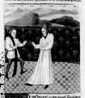 Parigi, Bibliothèque Nationale de France, Fr. 232, f. 329v. Giovanni Boccaccio incontra un uomo.