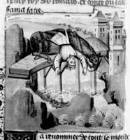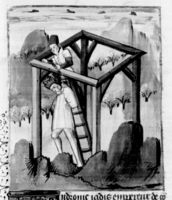 Parigi, Bibliothèque Nationale de France, Fr. 232, f. 325r. L'imperatore Andronico viene impiccato ad una forca.
