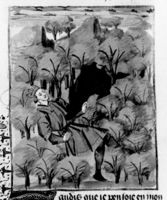 Parigi, Bibliothèque Nationale de France, Fr. 232, f. 337r. Filippo il Bello viene sbranato da un cinghiale durante una battuta di caccia.