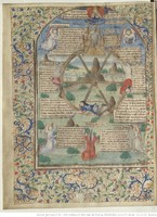 Parigi, Bibliothèque de l'Arsenal, 5192, f. 1v. Un essere antropomorfo con la corona e lo scettro (la Fortuna?) siede in cima alla ruota che controlla i destini degli uomini, cui sono aggrappati tre personaggi metà uomini e metà animali; in alto il busto di Dio Padre si affaccia tra le nubi, mentre alcuni angeli indicano la scena.