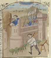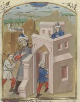Parigi, Bibliothèque de l'Arsenal, 5192, f. 6v. Nembrot sovrintende alla costruzione della Torre di Babele.