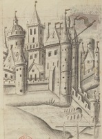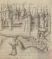 Parigi, Bibliothèque Nationale de France, Fr. 25528, f. 42r. Il copista del manoscritto è Pierre d'Amboise. Veduta della città di Troia.