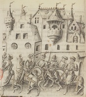 Parigi, Bibliothèque Nationale de France, Fr. 25528, f. 19v. Il copista del manoscritto è Pierre d'Amboise. Criseide osserva Troiolo passare a cavallo sotto la sua finestra insieme ad un gruppo di giovani.
